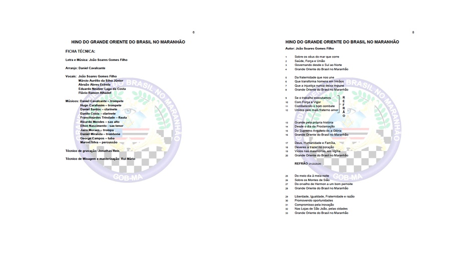 Através da Lei nº 003/2020, publicada no Boletim do GOB-MA nº 470, de Janeiro de 2021 da E∴ V∴, foi oficializado o Hino do Grande Oriente do Brasil no Maranhão (GOB-MA), de autoria do Eminente Ir∴ João Soares Gomes Filho.